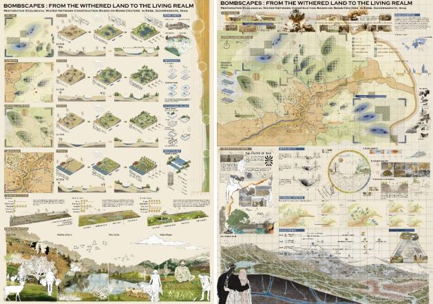 beat平台一等奖的作品《BOMBSCAPES:FROM THE WITHERED LAND TO THE LIVING REALM》聚焦伊拉克库尔德斯坦地区战后遗留弹坑问题,选取Halgurd-Sakran National Park区域作为研究对象,面对当地战争后土地破损、严重缺水、环境恶劣的条件,通过利用战后遗留弹坑构建区域水网系统,实现水资源的收集与利用,以此恢复多种生境进而与产业结合,将原本被战争侵蚀、残破不堪的场地重新赋予生机,实现当地生产、生活和生态环境的可持续发展。