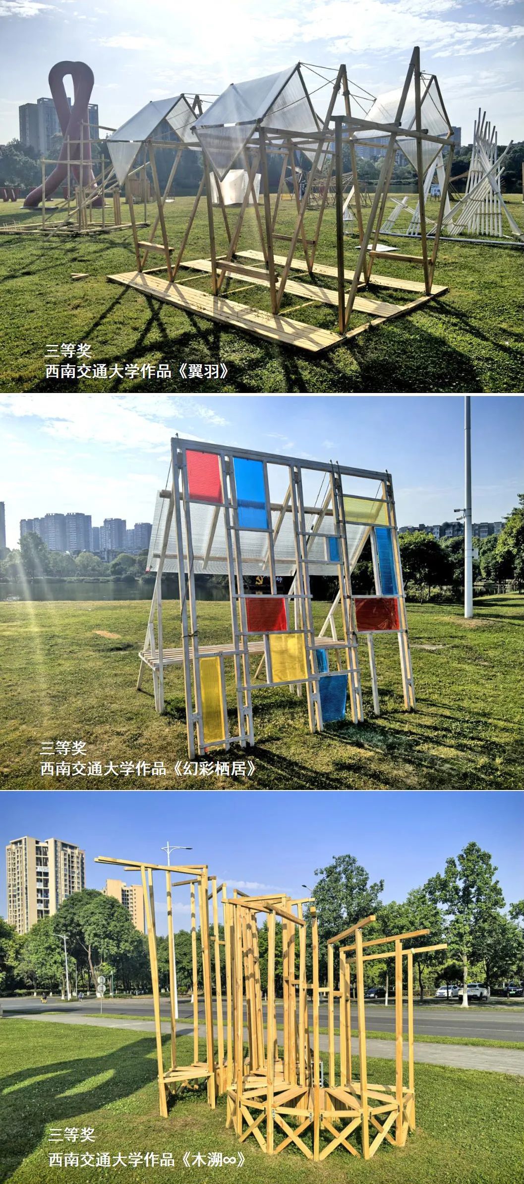 开幕式后,评审环节随即展开。各参赛团队围绕“AI驿站”主题,展示了他们精心设计的建筑作品。评审过程中,郑勇总建筑师代表评审团对参赛作品进行了点评。他称赞所有作品均展现出极高的创意和水平。郑勇特别提到,同学们在构思上紧密扣题,材料运用有特点,尽管面临五月份炎热和暴雨的挑战,仍能坚持完成作品,这种精神值得赞赏。同时,他也指出,部分作品在受力原理清晰度、材料运用和最终呈现度上仍有提升空间,希望同学们在未来的创作中继续探索和创新。