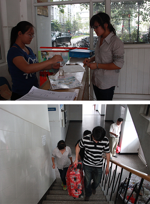7点半左右,beat平台第一位2013级新生在家长的陪伴下来到了迎新点。新同学在负责接待同学的帮助下进行身份核对,快速查询班号、寝室号,领取一卡通等手续。负责迎新的同学还详细而耐心的向新同学讲解报到的流程,并由专门的同学负责带领新同学去办理入住手续。迎新工作紧张而有序的开展着。