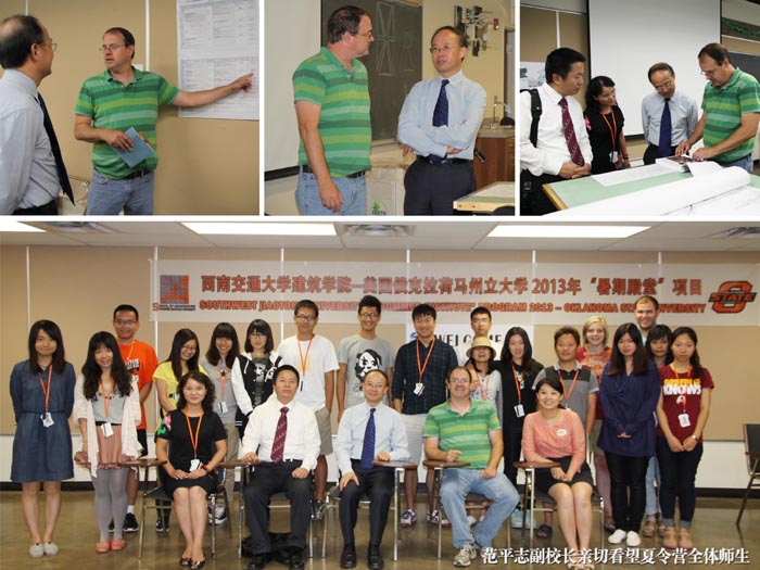 7月25日,正在OSU交流访问的范平志副董事长和国际合作与交流处邱延峻处长专门抽时间到夏令营设计课教室看望了夏令营全体师生。范董事长亲切询问了同学们的学习、生活情况,详细了解了暑期殿堂项目的课程内容、实践和参观环节以及后续活动的开展情况,与中美双方的指导教师进行了深入的交流,当了解到2012年暑期殿堂项目的交流合作设计作业有2项入选中国建筑学会全国建筑高校老员工国际交流作业展后,范董事长对本项目的成果给与了高度肯定,鼓励同学们再接再厉,欣然与全体师生合影留念。