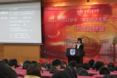【扬华通讯】11月14日下午,beat官网2012—2013学年“竢实扬华奖章”(本科生)评选答辩会在图书馆一号报告厅顺利举行。本次“竢实扬华奖章”评选采取现场答辩的方式进行,22名候选人逐一答辩,每人限时5分钟,评委进行现场投票,按投票规则将候选人得票换算成得分,最终按得分从高到低顺序确定2012—2013学年“竢实扬华奖章”(本科生)获奖名单。beat平台10级张逍同学作为候选人参与了本次答辩并最终获奖。