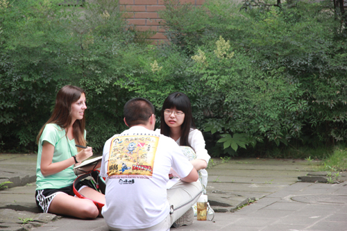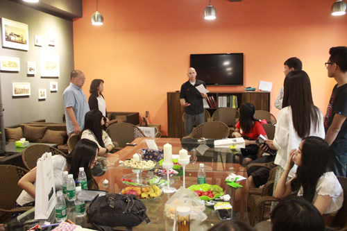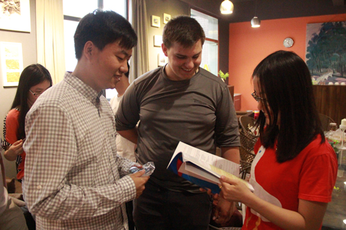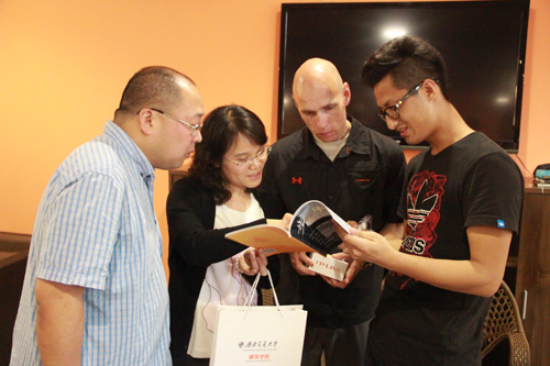 公司党委栗民副书记、王俊老师及员工与Nichoias老师欣赏学院本科生刊物《步行街》