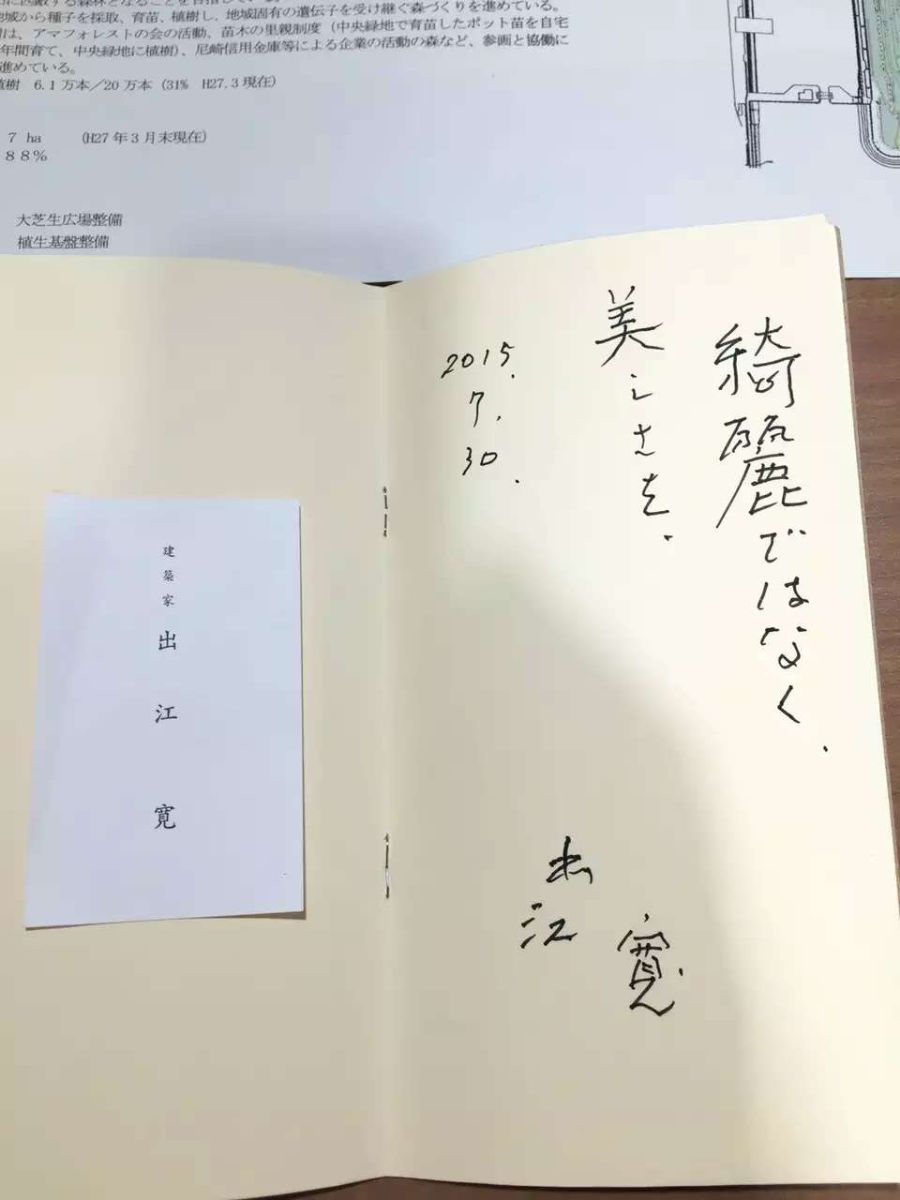 出江宽老师给员工的寄语,寄语内容译为:看上去漂亮的建筑还不能说就是好建筑。只有可以称之为美的建筑才是真正的好建筑。