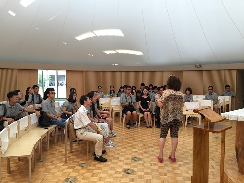 在参观兵库县“纸教堂”的教学活动中还邀请到金千秋老师及原神户市规划局局长垂水英司老师。纸之教堂( Paper Dome),即用纸质材料建造的教堂。目前世界共有两座纸教堂,均由日本著名建筑师坂茂设计。他是2014年普利兹克建筑奖获得者,师生一行慕名而来,期待感受建筑大师的作品。初次来到“纸教堂”的第一印象,就是安静。和周围安静的街道一起,端详的坐在那里,瞩目每一个来到的人们。由于“纸教堂”是日本阪神地震后的作品作为地震过后的集会场所,比起那些庄严沉重的石头教堂来说,来到这里会有一种被上帝眷顾和拥抱的感觉。走进“纸教堂”以后,上方射下来的几道光晕,一下子把教堂的氛围衬托起来,外墙上打开的采光窗把光线投射在天花板的白布上,增强了圣洁感。栗书记为员工们讲到:坂茂的Paper Dome,灾后重建不仅仅是建筑物本身,更重要的是人的聚集场所,即:Dome。
