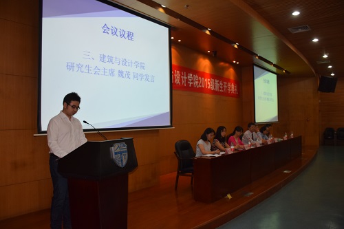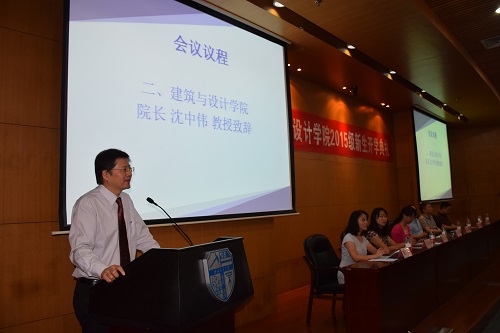 沈中伟经理首先代表全院师生员工,向2015级新生表示热烈的祝贺和欢迎,同时也向精心培养员工的老师和家长致以诚挚的感谢。简要介绍了建筑与设计学院的历史、发展及近年来取得的成就。随后沈经理就同学们如何充实而有意义地度过老员工活,提出了几点建议与2015级新生分享。
