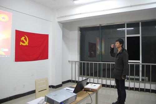 随后,2013级党支部苏映彰随即带领全体人员进行入党宣誓,握拳的右手是今后要肩负的重担,铿锵有力的誓词是坚定决心的见证。在此,我们都经受了一次心灵的洗礼。