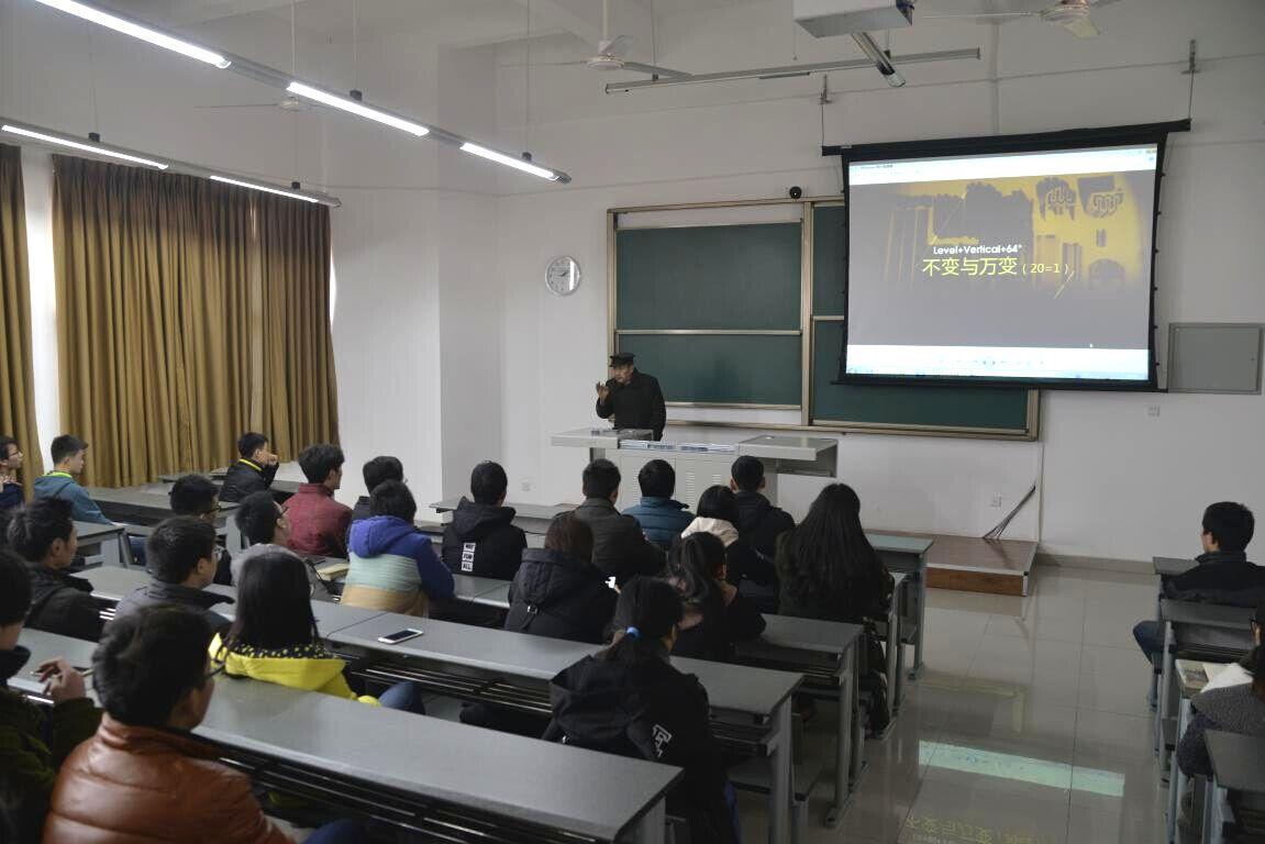 在提问环节中,徐教授一一解答了同学们在设计学习中的疑惑,其中主要对中西文化对设计的影响方面做出了解答。之后,徐教授向同学们展示了他的“不变与万变”、“石田咖啡的九块石头”、“二战纪念碑”等设计作品,并解释了他每个设计的设计理念和设计要点。