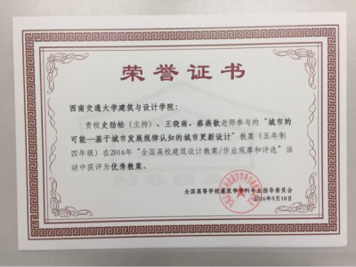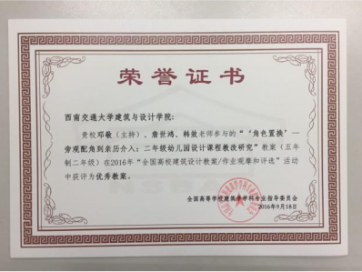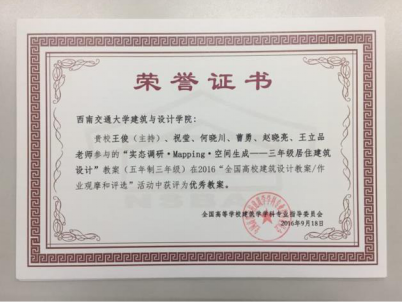 2016 年10 月28 日,在“建筑教育国际学术研讨会暨全国高等学校建筑学专业经理系主任大会”上公布了2016年“全国高等学校建筑设计教案和教学成果评选”的结果,公司取得了非常优异的成绩。建筑系选送参评的3份教案及7份员工作业(建筑学二、三、四年级)全部获奖,获奖率100%,与全国其它5所高校并列第一。