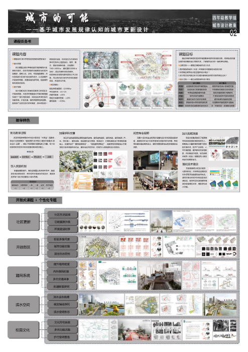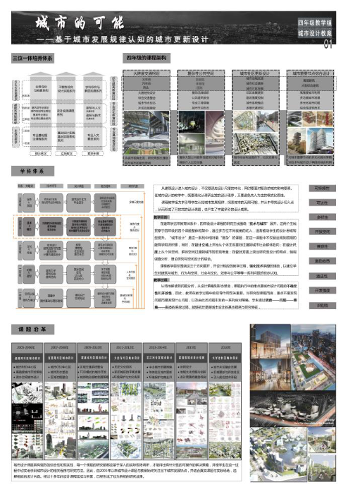 四年级城市设计单元,在设计立场上开始从个体主观喜好过渡到城市社会群体趋向,在设计尺度上从个体空间、群体空间过渡到城市的宏观考量;在设计方法上突出研究型设计的特点,强调调查分析、理论研究与空间设计的结合。课程教学围绕这三个方向展开,并设计相应的教学过程,强化技术手段的辅助,以建立员工对建筑与城市、行为与空间、社会与文化、效率与公平等一系列问题的初步认知。