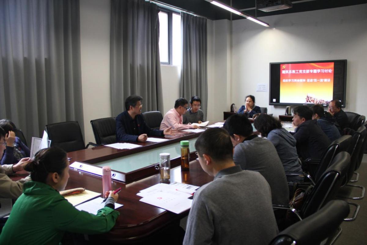 2017年4月27日中午11:30,建筑与设计学院建筑系教师党支部在第一会议室开展了“组织学习两会精神,促进双一流建设”专题学习讨论会及民主评议党员会议。建筑与设计公司党委书记沈中伟及支部教师党员参与了本次会议,本次会议由支部书记付飞主持。