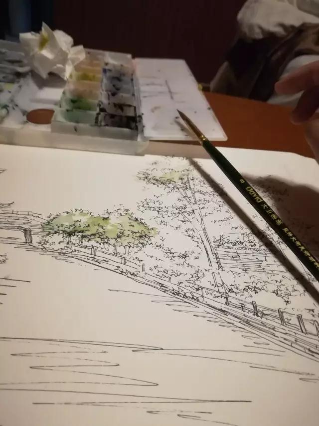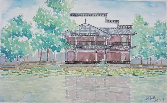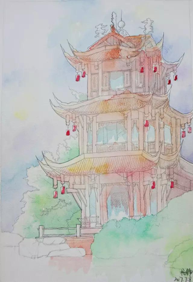 “水彩实习”这门课程是西南交大建筑与设计学院建筑学、城市规划、风景园林专业大二暑期的实习课程,在经过了半学期的课堂写生学习后,大家逐渐过渡到优美的户外风景写生中来。我国的建筑学科教育体系,也是参照西方教育体系设置的,50年代以来的建筑设计类专业,都必须系统地学习绘画,素描和水彩画是必修科目,有些学院甚至把美术作为考核员工是否适合学习建筑设计的前提。著名建筑大师杨廷宝、梁思成、齐康,无一不是技法娴熟的水彩画家。当然,作为建筑师、规划师,扎实的美学功底是成为出色设计师必不可少的先决条件,它包含建筑寓意、构图、形体、对比、色彩、空间等因素。
