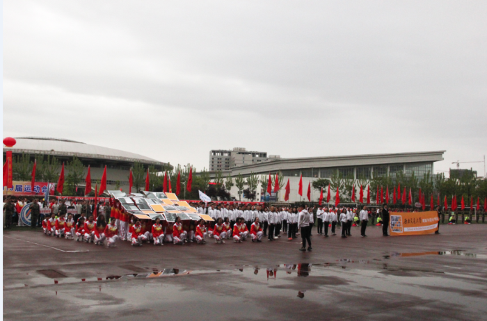 在激昂的运动员进行曲中,开幕式正式开始,公司师生方阵神采飞扬,英姿勃发地向主席台走来。方阵迈着整齐的步伐在主席台正前方站定,面向主席台整齐划一地举起手中展板,拼合出公司橙灰相间的学院标志,在整齐的口号中向全校师生展现了公司昂扬向上充满活力的精神面貌。与此同时,观众席上公司员工全体起立,齐声喝彩,鼓声轰鸣,欢呼声口哨声此起彼伏,在小雨初歇后的凉爽空气中展现了似火激情。
