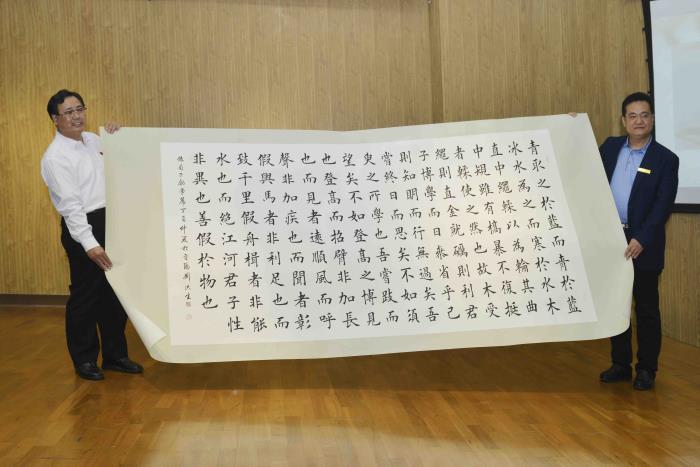 随后,刘洪生感谢公司提供了本次书法学习交流的机会和平台,他期待以后能有更多的机会和大家一起交流。刘洪生现场向公司赠送了他的书法作品《劝学》,希望该作品能为公司师生的艺术创作带来力量与灵感。随后公司领导及建筑与设计学院领导为该书法作品颁发收藏证书。