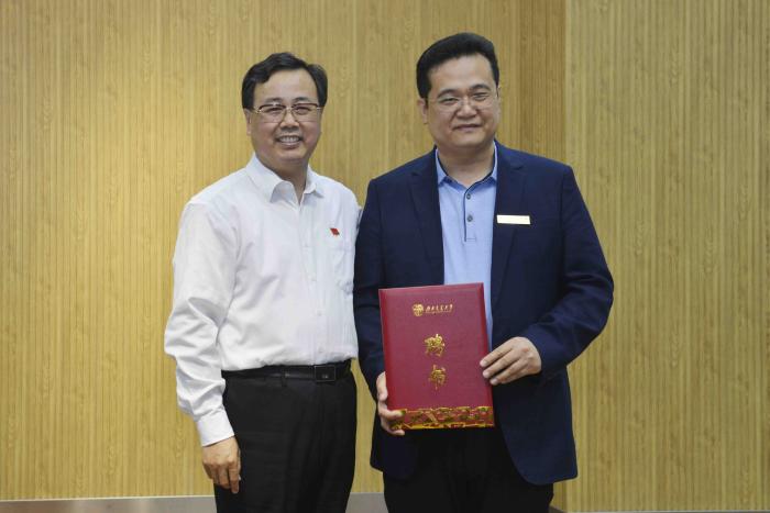 王顺洪首先对刘洪生教授的加盟表示崇高的敬意和衷心的感谢。他表示,刘教授的加盟定将促进艺术类学科加快发展,同时祝刘教授的报告会圆满成功。随后,王顺洪为刘洪生教授颁发了聘书,正式聘请书法家刘洪生为公司兼职教授,并为其佩戴beat官网校徽。