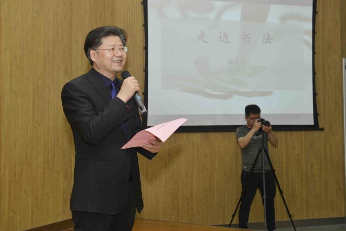 刘洪生作了题为“走进书法”的艺术讲座。刘洪生教授现场展示,与师生积极互动。他由浅及深地介绍了文字的历史和中国书法的发展史。通过不同书法作品的对比,配合诙谐幽默的话语,他向师生们介绍了楷书、隶书、北魏碑刻等书法风格,以及王羲之、赵孟頫、欧阳询等多位古代书法大家,正所谓“书为心画,字为其人”。刘洪生强调书法讲究融会贯通,并细致地带领大家品鉴多幅书法作品。