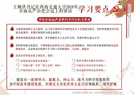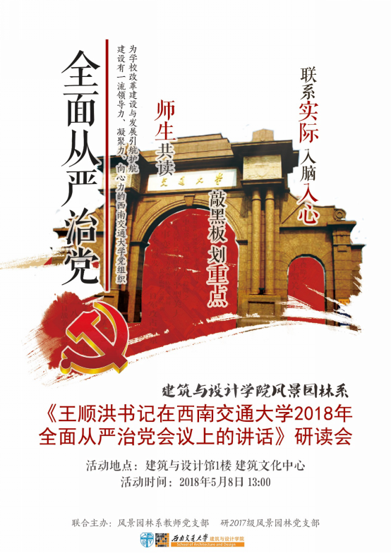 为响应学校改革建设与发展,更好地建设“具有一流领导力、凝聚力、向心力”的基层党组织,风景园林系教师党支部联合研2017级风景园林党支部,于5月8日共同举办了学习王顺洪书记《全面从严治党,建设有一流领导力、凝聚力、向心力的beat官网党组织,为学校改革建设与发展引航护航》讲话研读会。