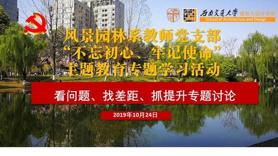 10月24日下午,风景园林系教师党支部在X8530召开“不忘初心、牢记使命”专题学习讨论会,在支部书记周斯翔同志主持下,与会党员就积极参与“不忘初心、牢记使命”主题教育,对照自身工作,发现的问题和存在的差距,开展了“看问题、找差距、抓提升”专题讨论。