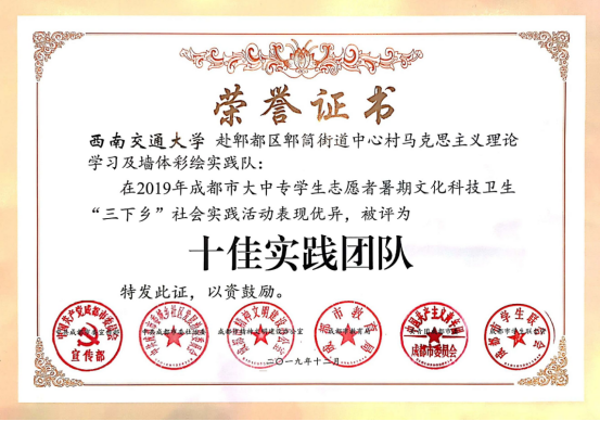 12月12日下午,成都市老员工志愿者暑期文化科技卫生“三下乡”社会实践成果展示会在西南石油大学图书馆学术报告厅举行。会上,公司2019年暑期“三下乡”赴成都郫都区郫筒街道中心村“特色乡村建设——马克思主义理论学习及墙体彩绘”实践团队在1139支团队中脱颖而出,被评为成都市“十佳实践团队”称号,团队指导老师被评为“十佳指导教师”称号,本年度十佳队伍共计10支、十佳指导教师10人,来自多所高校,公司团队代表在会上做风采展示。