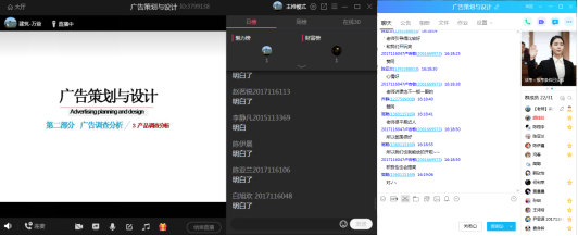 2020年2月24日开学第一周、星期一的1-5节课,员工到课率100%;广告策划与设计课程通过腾讯课堂的实时语音+实时文字的互动方式,顺利完成线上教学工作。7:50分用“清晨”的音乐开启了直播间,让同学们进入直播间顿感心情舒畅、又充满兴趣与好奇。点名后开始上课,在授课中通过与员工实行实时文字反馈手段,效果很好,反馈比平时上课的积极性增加;同时通过实时提问的方式、回答的方式,实现了线上“面对面”教学,互动效果好。在课间休息时,也选用不同的音乐调节气氛。员工们反映知识获取完全没有问题,员工说:“跟老师互动我也不紧张了”、“视频还是别吧,怕丑到大家”“在屏幕后面比较放得开”“老师讲课也不一板一眼的”,通过员工们的意见反馈,证明这次线上授课取得了如期的教学效果。