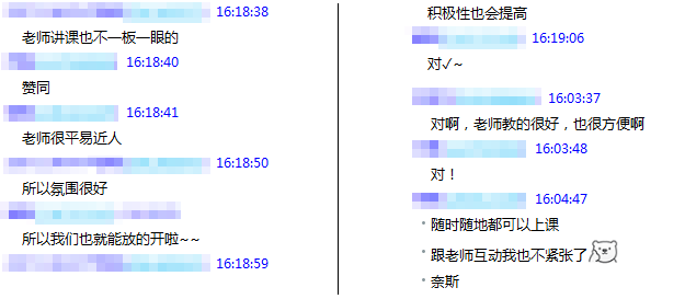 在课前老师通过提前发送问卷调查和在qq群中交流了解我们的学习情况,课上以师生互动为主,能第一时间获得老师的指导,课下老师通过超星回访教学情况,也经常通过qq为我们答疑解惑。