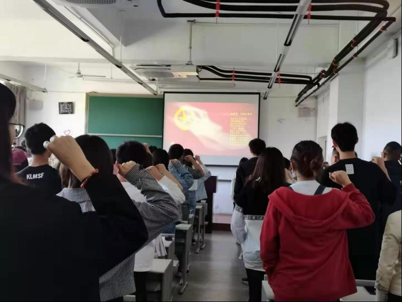 在钱秋凡老师的带领下,新团员面对着鲜艳的中国共青团团旗,举起右手,向团组织庄严宣誓。全体到场团员也与新团员一起重温入团誓词。铿锵的誓词,激励着在场的每一位团员。本次活动在全体团员嘹亮的奏唱团歌的歌声中落下帷幕。