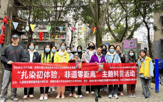 扎染主题科普活动过程中,我们通过展览,通过对扎染作品的展示来吸引社区居民的目光;讲解,通过扎染科普海报的制作张贴以及现场讲解使社区居民能够对扎染手工艺有一个初步的了解与认识;体验,通过和开设扎染体验摊点让社区居民进行扎染初体验,引起居民的兴趣。