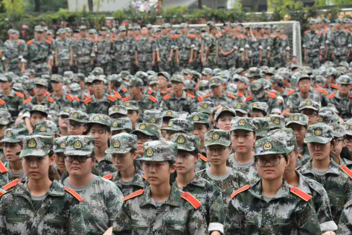 6000多名新生操场上列队而训,精神抖擞,整齐划一。他们听从教官的命令,在正午的烈日下站军姿,姿势标准,眼神专注。教官们也严格要求,不因炎热的天气而放松对动作的要求,他们站在队伍前方做示范,时而纠正同学们的动作。