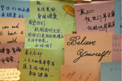 17日中午,活动工作人员在二食堂前拉起了巨大的宣传海报,制作高铁模型的铁质框架也在海报前等候着祝福的装点,同时,在现场进行快闪活动,吸引了路人的注意。小小的纸片,经过同学们笔下祝愿的渲染,会变成承载所有祝福的零件,共同构成满载梦想的高铁,将同学们美好的祝福带向福利院的每个孩子们的心里。经过一中午的努力收集,原先一张张空白的纸片被同学们的祝福塞满。“看到这些纸片,就好像看到福利院孩子们灿烂的笑脸,我就特别高兴和满足”,一位工作人员在接受采访时说道。