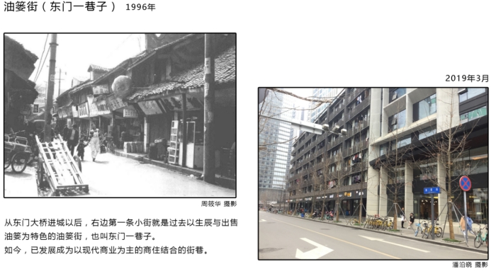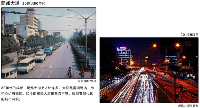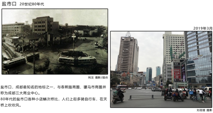 另外,展览还从成都商贸和交通街巷变化的视角出发,探索20个商贸节点和15余处街巷的发展变化。老旧的商业建筑被新建的商贸大楼所替代,却不曾磨灭原有浓厚的商业氛围,昔日风采不减。虽然桥梁、街巷、车站等经过了翻修与重整,道路两侧也变得高楼林立,但这里却依然保留着城市的某些文化符号与精神,以另一种形式继续诉说着成都的故事。