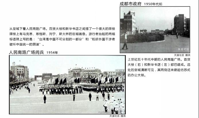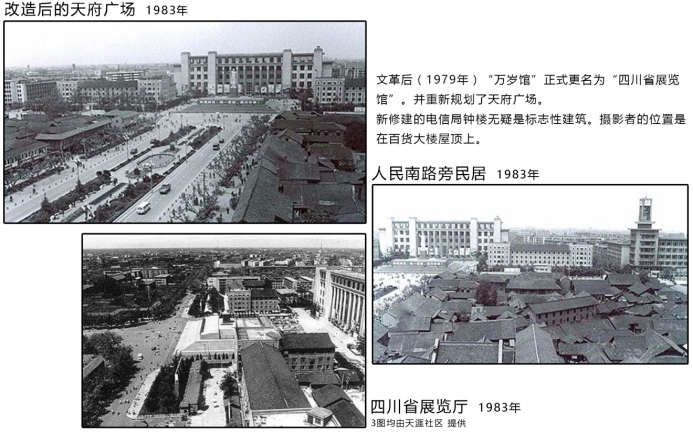 对于成都地标性节点——天府广场来说,其巨大的变化是时代发展的缩影。由康熙年间的皇城改建为贡院,密密麻麻的低矮的考棚是全川学子参加乡试、考取举人的科考场子。随着新中国的成立,古老的建筑逐渐被拆除变成了大型游行广场,原来的“致公堂”被拆除建起了“万岁馆”,后来改为“科技馆”。如今的天府广场周边高楼林立、商贸繁荣,景象与昔日大有不同。