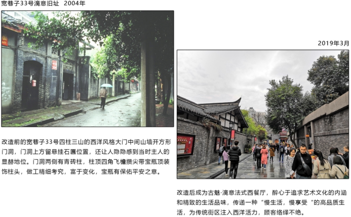 与太古里相比,古建保护视角下的宽窄巷子则是被誉为“成都的会客厅”。这里经过了2500年历史的浸润,保留了每一块古砖和每一寸土地。其中,有名的川西民居娟丽而不失大家气度,眼见厚重沧桑的门头、青痕斑斓的照壁、低矮逶迤的滴雨檐、方正齐整的天井都将历史的风采呈现在眼前。