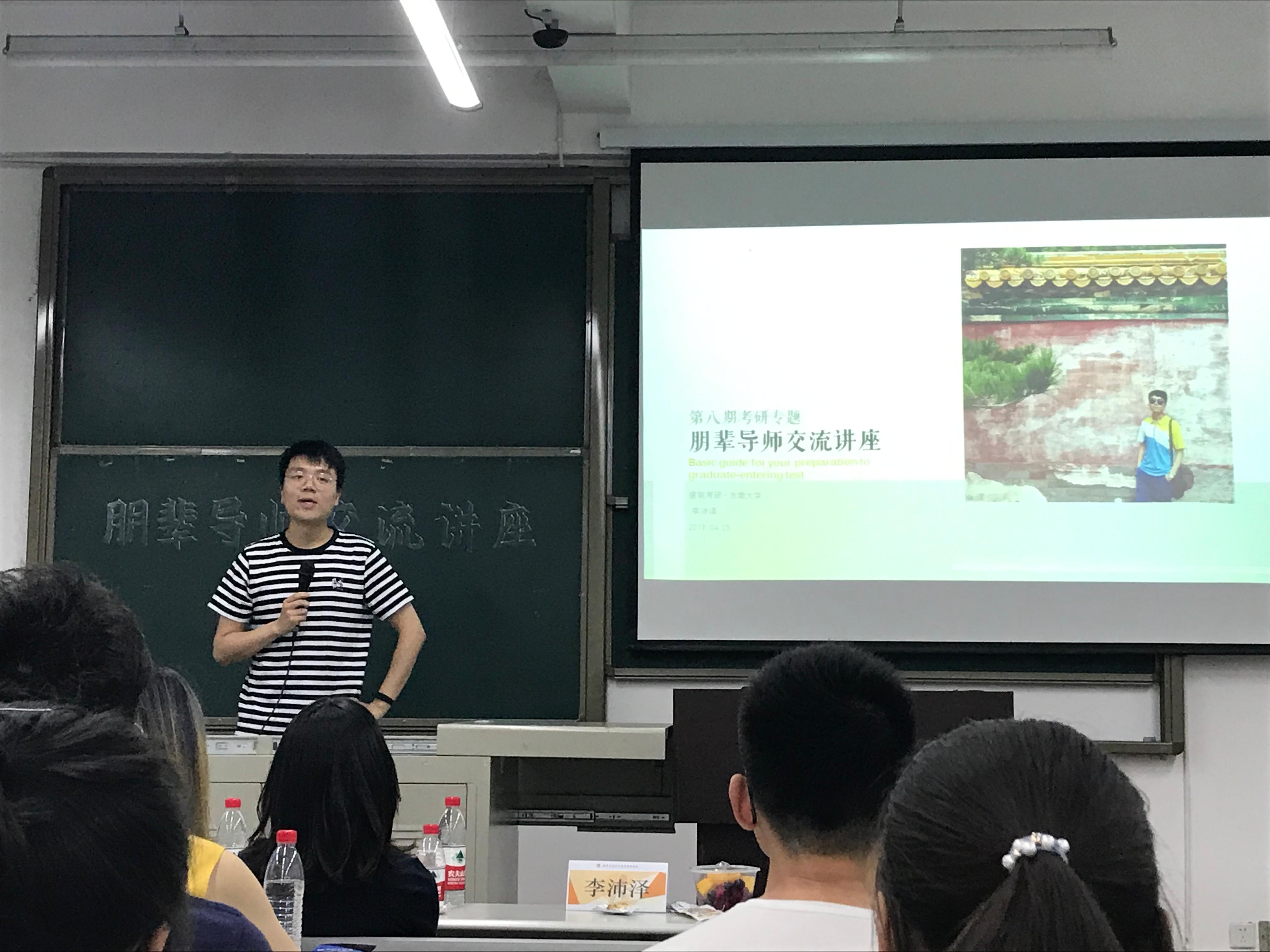 本次交流会为考研经验分享,分享人分别为14级建筑学考研至东南大学的李沛泽学长、15级产品设计考研至中南大学的朱晗璇学姐、14级建筑学考研至重庆大学的李鑫学长。
