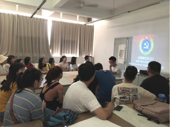 随后,大家共同观看了《国际歌》,并由何硕硕为大家详细介绍了该歌曲的创作背景和歌词的含义,带领大家一起了解了中国共产党的指导思想及中国特色社会主义理论体系的精髓,并以“十月革命给中国送来了马克思列宁主义”这句话,引入了此次“学习马克思主义思想渊源与发展历程”主题演讲。第一,何硕硕分别对马克思主义的三大组成部分及其理论渊源进行了讲解;第二,以《红楼梦》里的一段情节给大家解释了唯物主义与唯心主义概念和区别;第三,将空想社会主义与外国城市思想发展史联系起来进行解说,并结合案例概述了其局限性,以此引出了科学社会主义;第四,介绍了马克思所说“人类社会历史发展过程的五个阶段”,但是马克思主义活的灵魂体现在“具体问题具体分析”,所以不同的国家、民族或地区会因为历史条件、自然环境等方面的影响使发展过程产生一定差异。这种结合具体实例、多种方式并用的学习交流党的指导思想的新方式,使理论更贴近实践,富有趣味又易于理解。