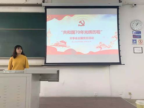 之后,大家就心中的感受进行了分享。肖涛鲡同志分享到,70年的光辉历程离不开共产党的领导,没有共产党就没有新中国和进入新时代的中国,70年来中国人民在中国共产党的领导下,前赴后继、百折不挠,取得了一系列成就,迎来了今天的国富民强,作为一名年轻的中共党员,在今后的学习生活中,我们要不忘初心,继续奋斗,努力学习专业知识,为祖国做自己力所能及的事;王唯同志分享到,从观看国庆大阅兵到今天的主题分享会,充满了感慨,70年来,从艰苦岁月到如今的高精尖科技的高速发展,感受到了祖国的未来充满了希望。70年前,周总理说飞机不够飞两遍,如今,空中梯队战鹰列列,山河无恙国富兵强,这盛世是多少先辈的负重前行,是中国亿万人民不断奋斗出来的,是在中国共产党的领导下才得以实现的,今后,我们要以实际行动和扎实工作为祖国建设作出自己的贡献,共同实现中华民族伟大复兴的中国梦。
