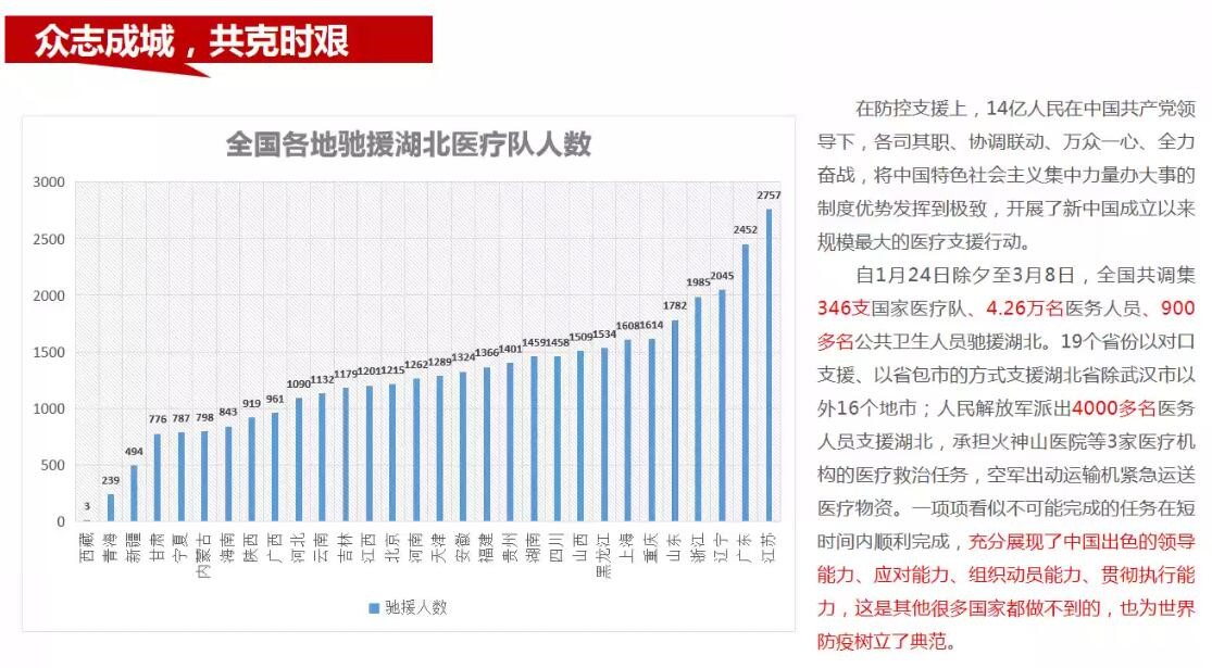 其次,从全国统筹方面看“抗疫”,刘一杰副书记强调了正是党的统一领导才形成了“全国一盘棋,集中力量办大事”的制度优势。抗疫战果赫赫的同时,国家为做好困难群众兜底保障工作,财政部进一步加大了对困难群众的保障力度,中央财政累计下达困难群众救助补助资金1560亿元,积极支持各地切实保障好特殊时期困难群众的基本生活。会议上,刘一杰副书记还提及了四川华西医院医疗队伍驰援武汉的新闻,让我们切身感受到了我国“众志成城,共克时艰”的抗疫方针。
