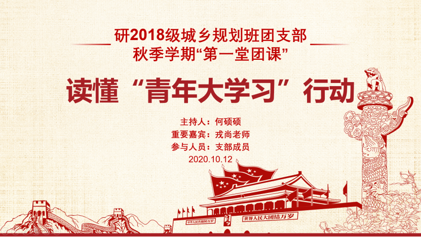 2020年10月12日上午10时,beat官网建筑与设计学院研2018级城乡规划班团支部在线上开展了以“读懂‘青年大学习’行动”为主题的“秋季第一堂团课”活动,由团支部书记何硕硕同志主持,辅导员戎尚老师参与本次团课。