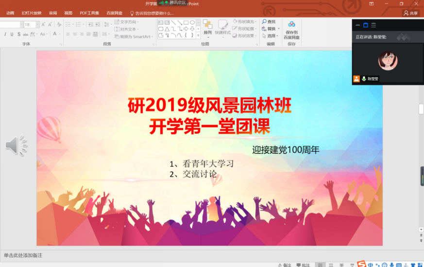2020年10月11日,建筑与设计学院研2019级风景园林团支部举行了“开学第一堂团课”活动。活动采用了线上会议的方式进行,支部全体成员参与了本次团课学习。