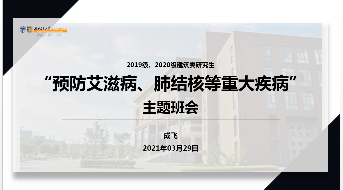 2021年3月24日晚上8时,2019级、2020级建筑类研究生班级开展了“预防艾滋病、肺结核等等重大疾病”主题班会,辅导员成飞主持本次会议。