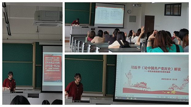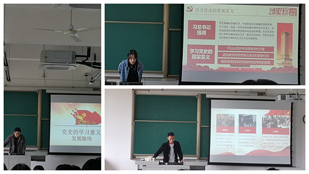 紧接着,苏润,陈畅,杨玄桦三位预备党员同志分别就“中华民族伟大复兴的三大里程碑”、“学习党史的重要意义”、“党史学习意义及发展脉络”给大家阐述了中国共产党的历史,让同学们进一步深刻理解到党的历史是砥砺前行、攻坚克难、刀刃向内、不断前行的历史,增强了同学们的爱国主义精神。