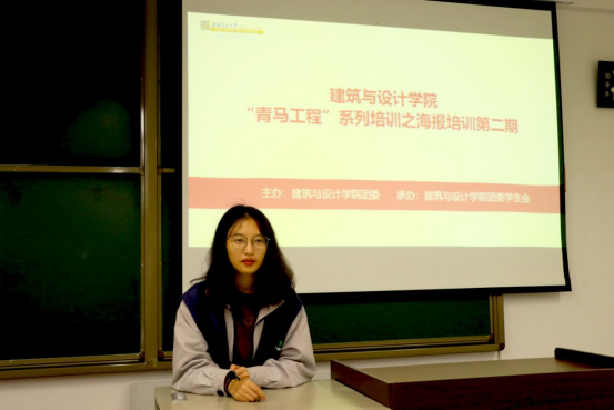 2021年10月23日,为了提高同学们使用软件技巧的能力,丰富同学们的课余生活,建筑与设计学院团委员工会在X8323为新成员们开展了“青马工程”系列培训之海报制作第二期培训。此次培训由员工会宣传部部长罗熳蕾主持并进行培训。