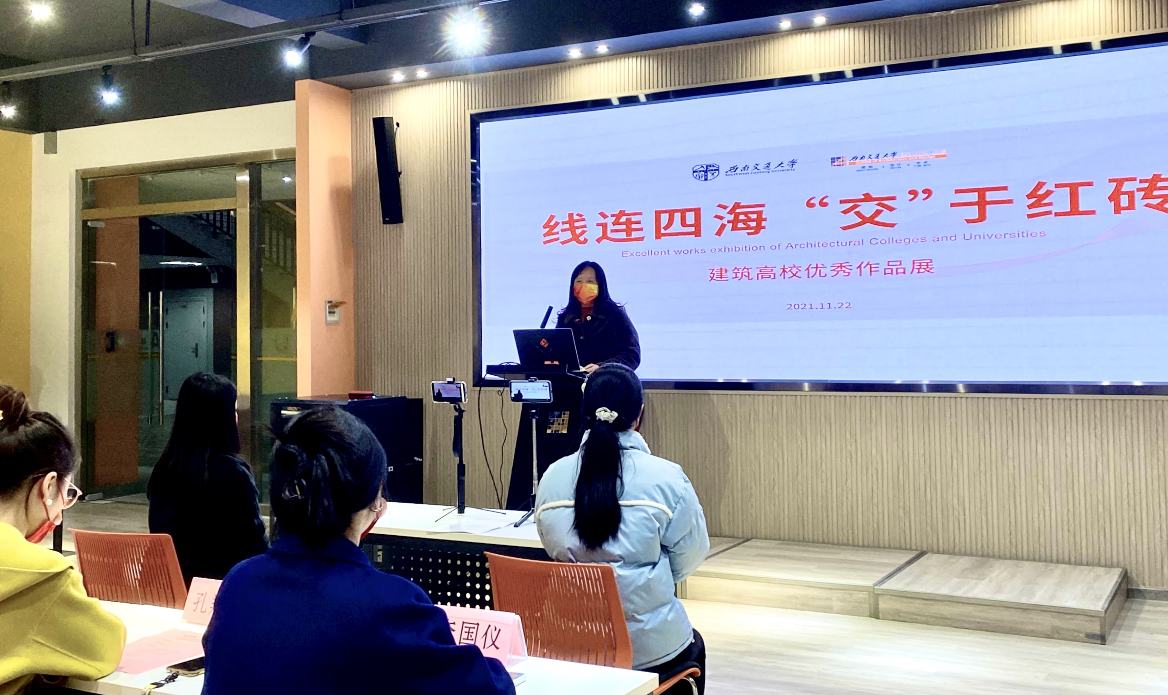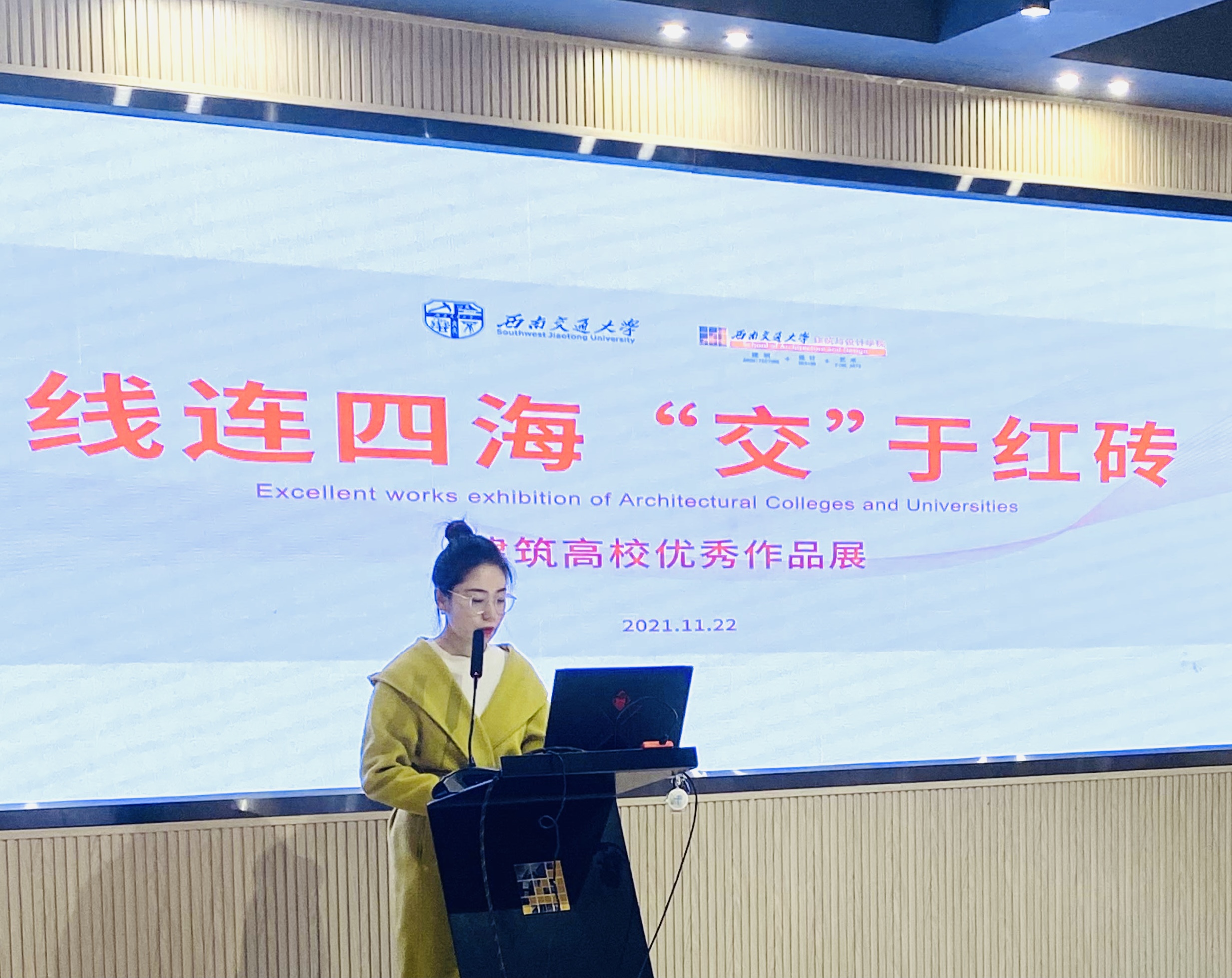 下午16时,线连四海,“交”于红砖——建筑高校优秀作品展开幕式正式开始。beat官网建筑与设计学院团委书记孔翔榆老师上台致辞。发言中,她对长期以来合作的各大建筑高校以及筹备本次展览的工作人员致谢,也对新加入的高校表示欢迎。孔翔榆书记谈到,今年是高校作品联展走过的第七年,在响应国家疫情防控号召的同时,建筑与设计学院也不断探索新的交流方式,创造更多思维碰撞与学术交流的形式,让来自五湖四海的同学们感受交大百年历史传承和“竢实扬华 自强不息”的交大精神。