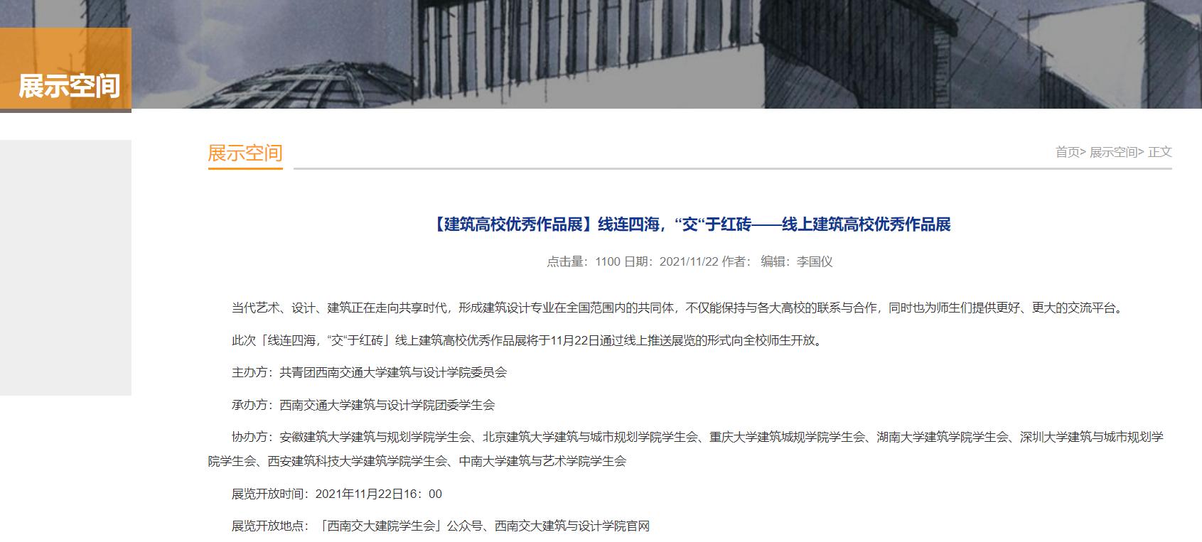 下午16时20分,建筑与设计学院团委书记孔翔榆老师宣布本次线连四海,“交”于红砖——建筑高校优秀作品展正式开始,建筑与设计学院团委员工会官方公众号平台、建筑与设计学院官网同步上线展览。