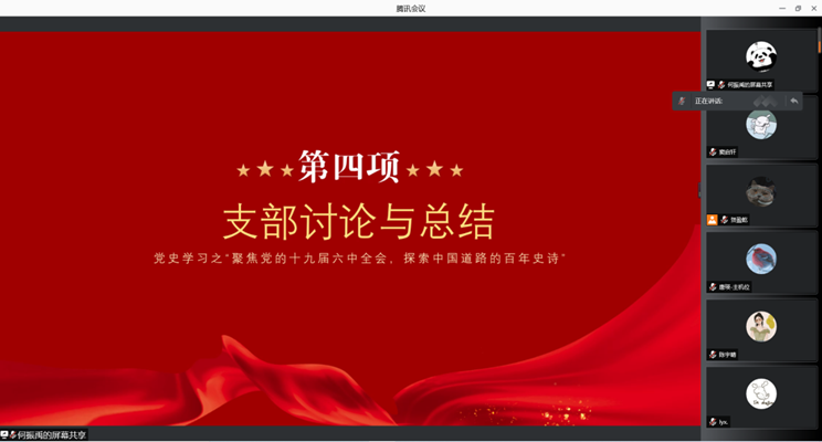 2021年11月11日19:00时,beat官网研建筑学专硕党支部于腾讯会议线上召开 “聚焦党的十九届六中全会,探索中国道路的百年史诗”主题组织生活会,支部全体党员及入党积极分子参加了本次会议。本次会议由何振禹同志主持。