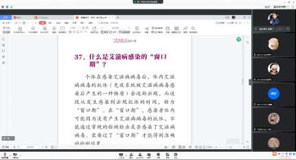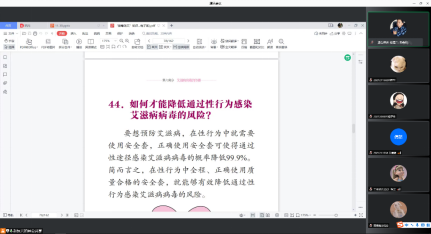 第二个环节,赵老师组织同学们一起学习了《珍惜爱 明白“艾”》宣传手册,完成了青年老员工艾滋病健康教育效果评估调查问卷,并且进行了课堂讨论,在问答环节中,辅导员赵恒兴针对第一环节所科普的知识进行了随机提问,同学们积极回答问题,并且纷纷表示作为当代研究生必须要学会保护自己,做到洁身自好,大会氛围轻松愉悦。