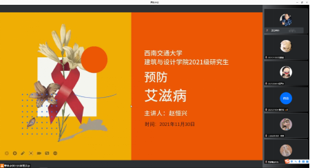 今年的12月1日是第34个“世界艾滋病日”,为贯彻落实《教育部等五部门关于全面加强和改进新时代学校卫生与健康教育工作的意见》,深化新时代学校卫生与健康教育,培养青年员工“自身健康第一责任人”意识,增强自我保护的能力,避免和最大限度减少感染艾滋病危险行为的发生,建筑与设计学院辅导员赵恒兴经过精心筹备,周密安排,于2021年11月30日18时开展了以“生命至上,终结艾滋,健康平等”为主题的线上年级大会。