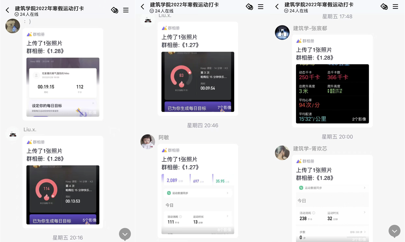 本次活动的开展主要依托QQ群打卡程序。参加运动的同学需要在规定时间内把运动成果截图或运动照片、视频上传至QQ群中。参与者每发布一次运动状态将获得相应积分,活动最后根据积分数目可获得相应奖励。七天的打卡活动中,同学们各展身手,跑步、足球、瑜伽、羽毛球等健身方式一应俱全,一张张照片中洋溢着建院学子的青春活力。