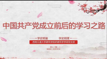 读史可以明智,知古方能鉴今。学习党史是坚持和发展中国特色社会主义、推进党和国家事业继续向前的一门“必修课”。为进一步增强支部凝聚力,不断提高党员同志自身综合素质。20220303日,研建筑学学硕党支部召开线上党组织生活会,开展“党史学习教育——中国共产党成立前后”的学习活动。活动由党支部张铭晏同志主持,支部党员、预备党员及部分入党积极分子参与。