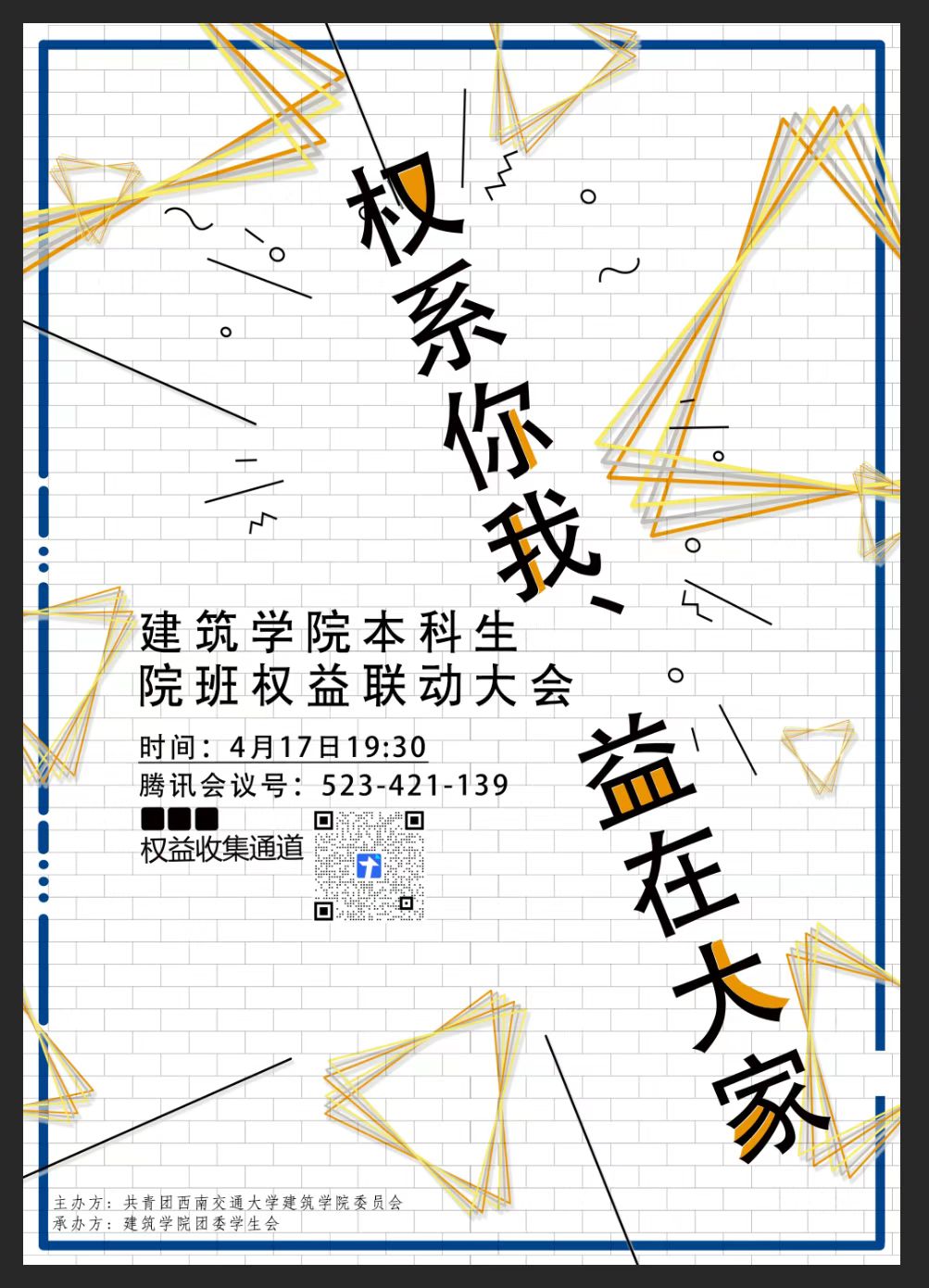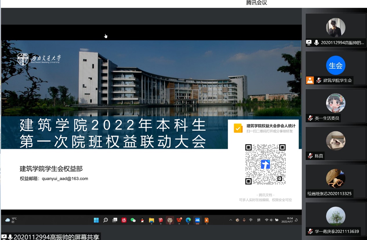 为帮助员工充分了解公司权益通道,与学院员工会进行提案对接,维护自身在校权益,2021年4月17日19时30分,由beat平台团委主办、beat平台团委员工会承办的beat平台本科生2022年第一次院班权益联动大会通过腾讯会议线上召开。会议由员工会权益部部长高振帅主持,学院本科2020级、2021级生活与权益委员参加会议。
