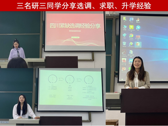会议伊始,杨珂老师对整个年级的就业形势进行了分析,并重点分析了风景园林专业的就业形势,对进行分享的各位同学表示了感谢与祝贺,紧接着考取了2022年四川省紧缺选调生的邓舒曼同学、获得成都设计咨询集团OFFER的张弘毅同学和成功申请到同济大学风景园林博士的陈莹莹同学进行分享。邓舒曼同学就选调生考试的备考过程进行了详尽的经验分享,并总结了近几年选调情况,引发了同学们的积极提问与交流。张弘毅同学根据重要求职时间节点提醒同学们提前做好充足的准备,制作相对应的简历,并鼓励大家不要害怕失败,调整好心态,一定能取得满意的结果。对于博士的申请过程,陈莹莹同学就时间安排、材料准备等相关方面进行了经验分享,着重向我们介绍了博士申请过程中的笔试和面试情况,建议提前联系目标学校的导师。