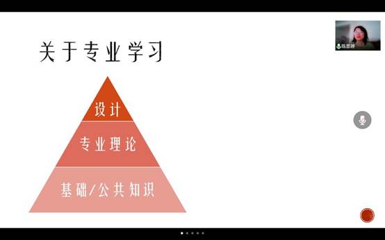 陈春谛老师首先讲述了她的求学经历,从高中毕业面临的专业选择到本科、硕士一直到博士的认知变化与心路历程。陈老师深入分享了个人的体会,关键词是“选择“。很多时候最终的选择与最初的设想会有出入与失真,此时我们就更要在其中发现趣味。生活中总要不断做出选择,每一次选择都意味着要放弃另外的很多可能。谁都不能确定自己的选择能不能是”best choice“,所以不要因为错过那些可能性而遗憾,对得起每一次选择便是对自己的人生负责。接着陈老师将高中与大学做了比对,否定了高中老师“到了大学就轻松了“的错误想法,让同学们对大学的生活做到心中有数。最后陈导师让我们打开自己的摄像头同我们一一交谈,了解了我们每个人对本专业的认识。陈春谛老师提出,这是一个全局性的专业,理性与艺术兼存,并向同学们介绍了专业的就业前景并嘱咐大家一定要对自己的学习做好规划。